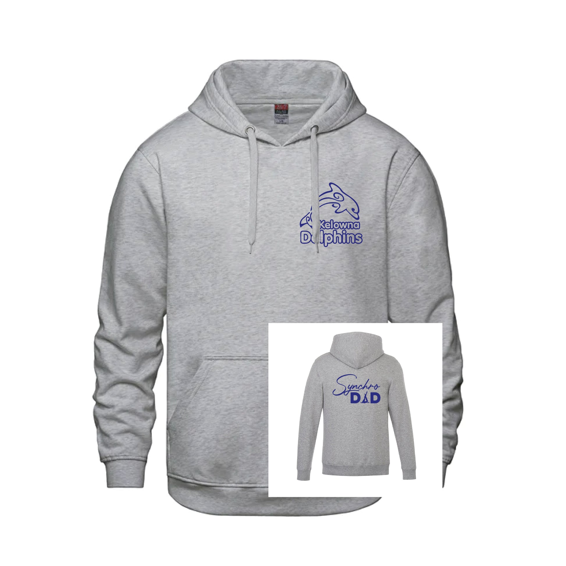 Kelowna Dolphins Synchro Dad - A comfy way to represent your Kelowna Dolphins Artistic swim team. These hoodies are a perfect blend of comfort, durability and everyday versatility. You will not be disappointed in the with the soft breathable cotton-blend fabric, an adjustable drawstring hood, a spacious kangaroo pocket, and ribbed cuffs and hem for a secure, comfortable fit.