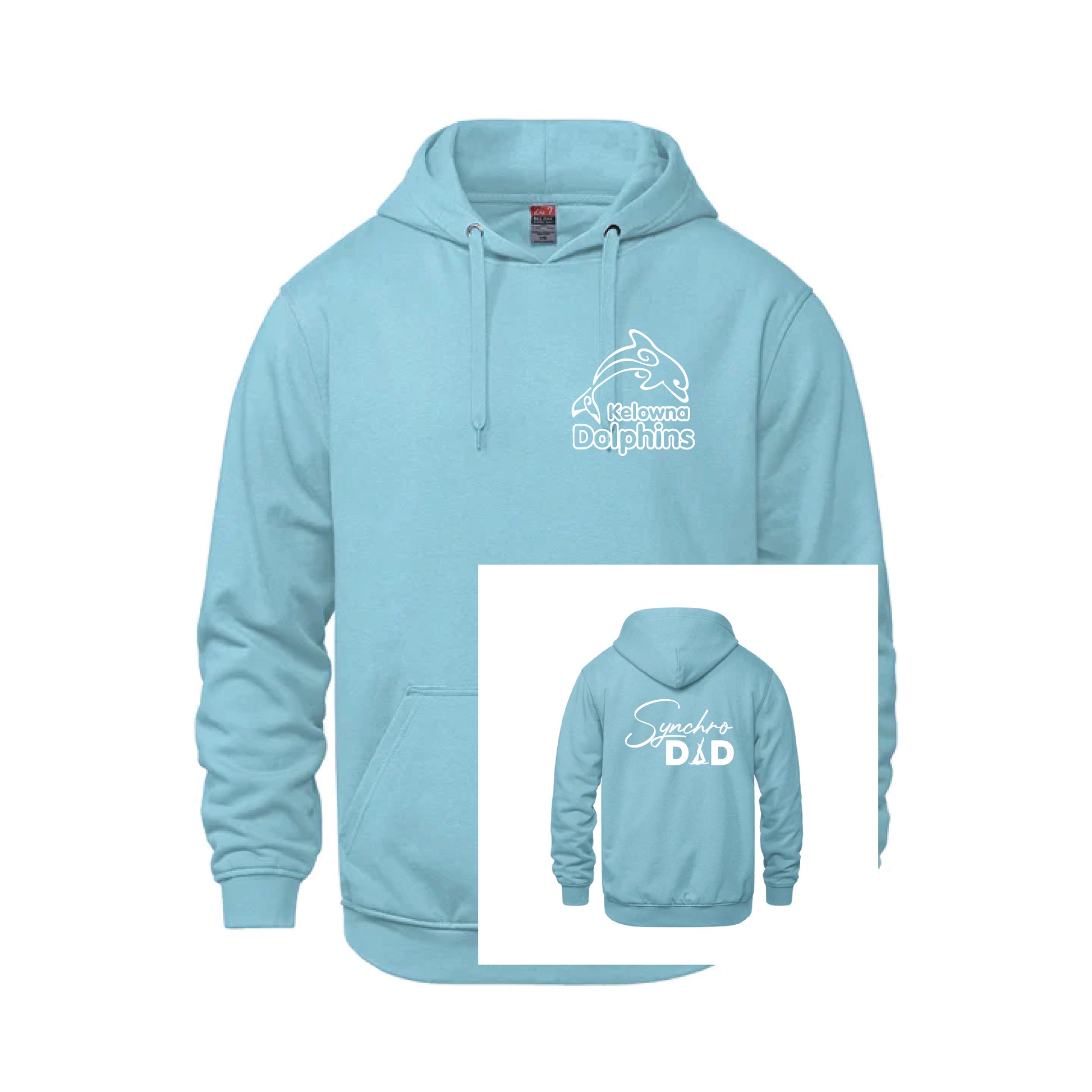 Kelowna Dolphins Synchro Dad - A comfy way to represent your Kelowna Dolphins Artistic swim team. These hoodies are a perfect blend of comfort, durability and everyday versatility. You will not be disappointed in the with the soft breathable cotton-blend fabric, an adjustable drawstring hood, a spacious kangaroo pocket, and ribbed cuffs and hem for a secure, comfortable fit.