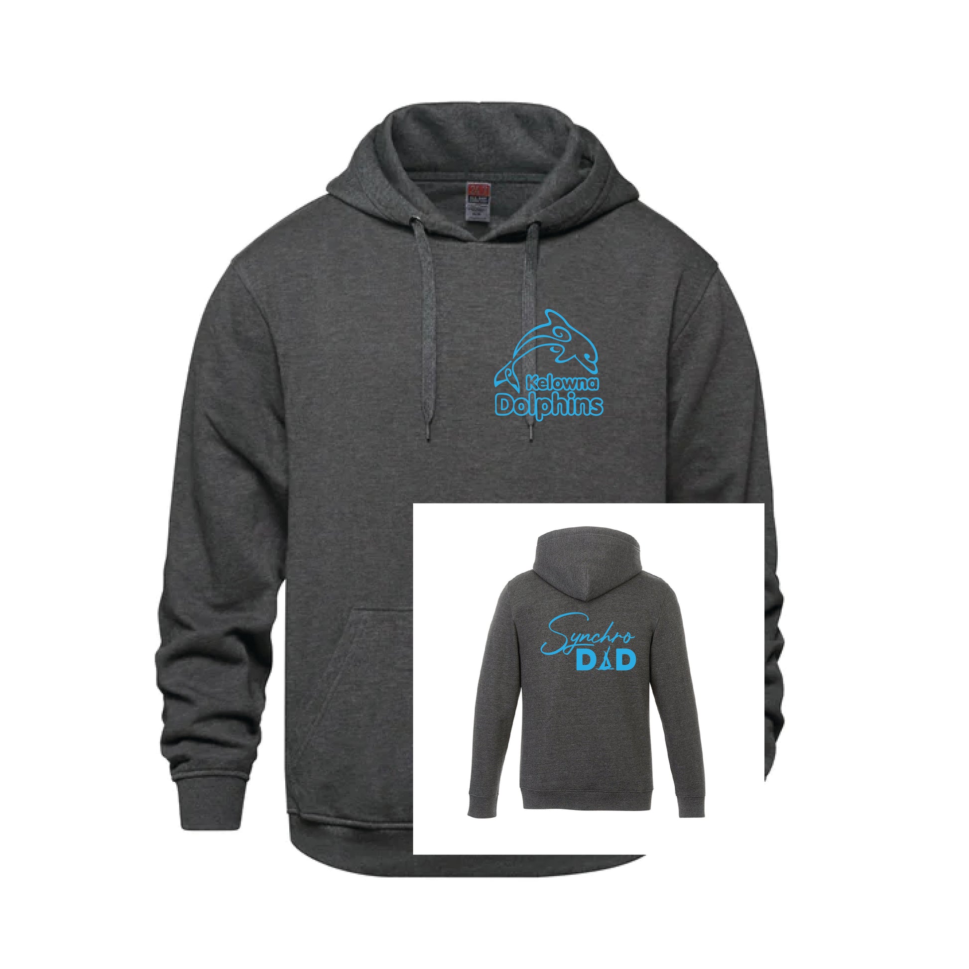 Kelowna Dolphins Syncro Dad - A comfy way to represent your Kelowna Dolphins Artistic swim team. These hoodies are a perfect blend of comfort, durability and everyday versatility. You will not be disappointed in the with the soft breathable cotton-blend fabric, an adjustable drawstring hood, a spacious kangaroo pocket, and ribbed cuffs and hem for a secure, comfortable fit.