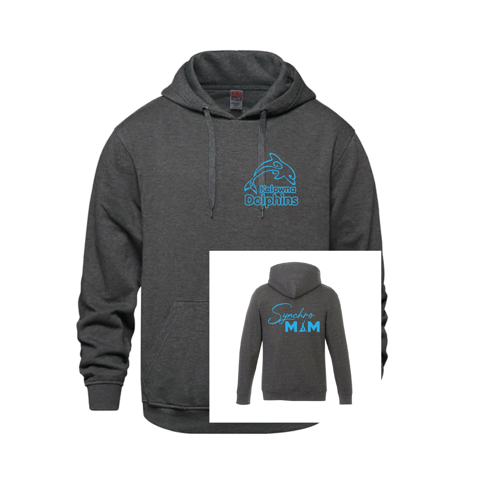 Kelowna Dolphins Synchro Mom - A comfy way to represent your Kelowna Dolphins Artistic swim team. These hoodies are a perfect blend of comfort, durability and everyday versatility. You will not be disappointed in the with the soft breathable cotton-blend fabric, an adjustable drawstring hood, a spacious kangaroo pocket, and ribbed cuffs and hem for a secure, comfortable fit.